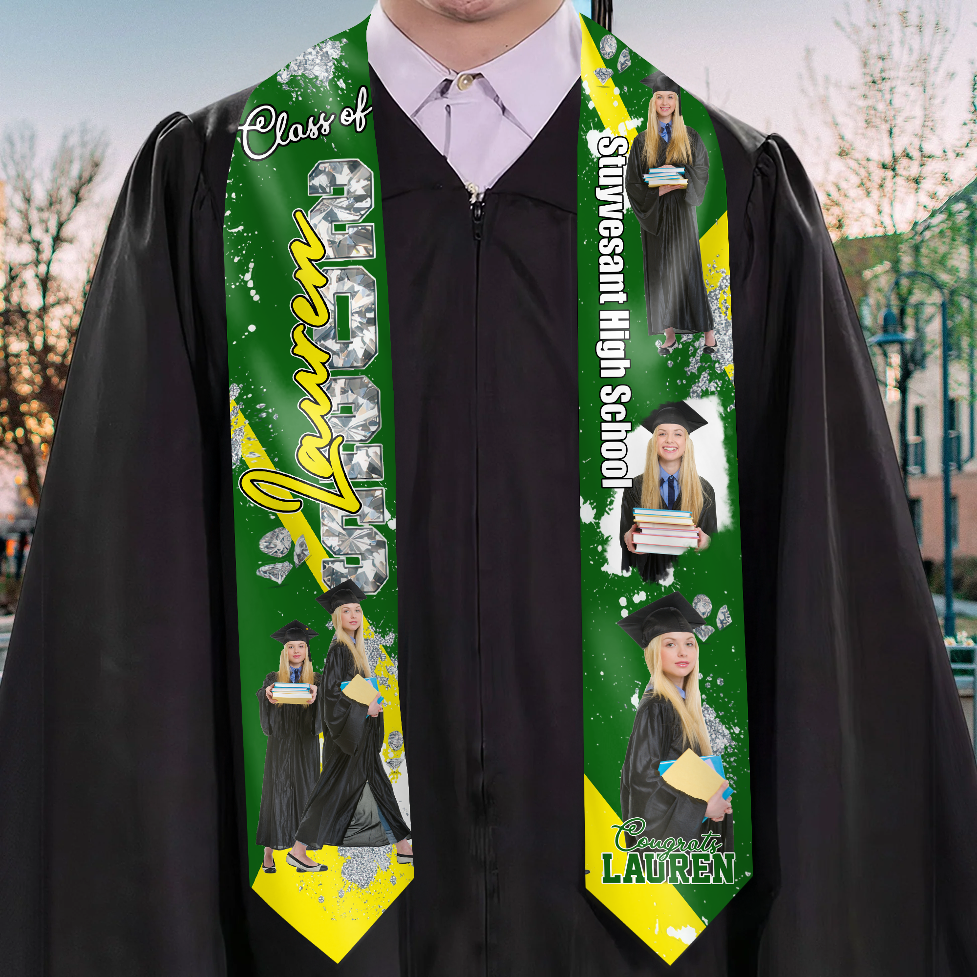 Crafted with high-quality satin material, this graduation stole is not only visually impressive but also comfortable to wear. The vibrant colors and smooth texture provide a stunning backdrop for the personalized flags and photo.