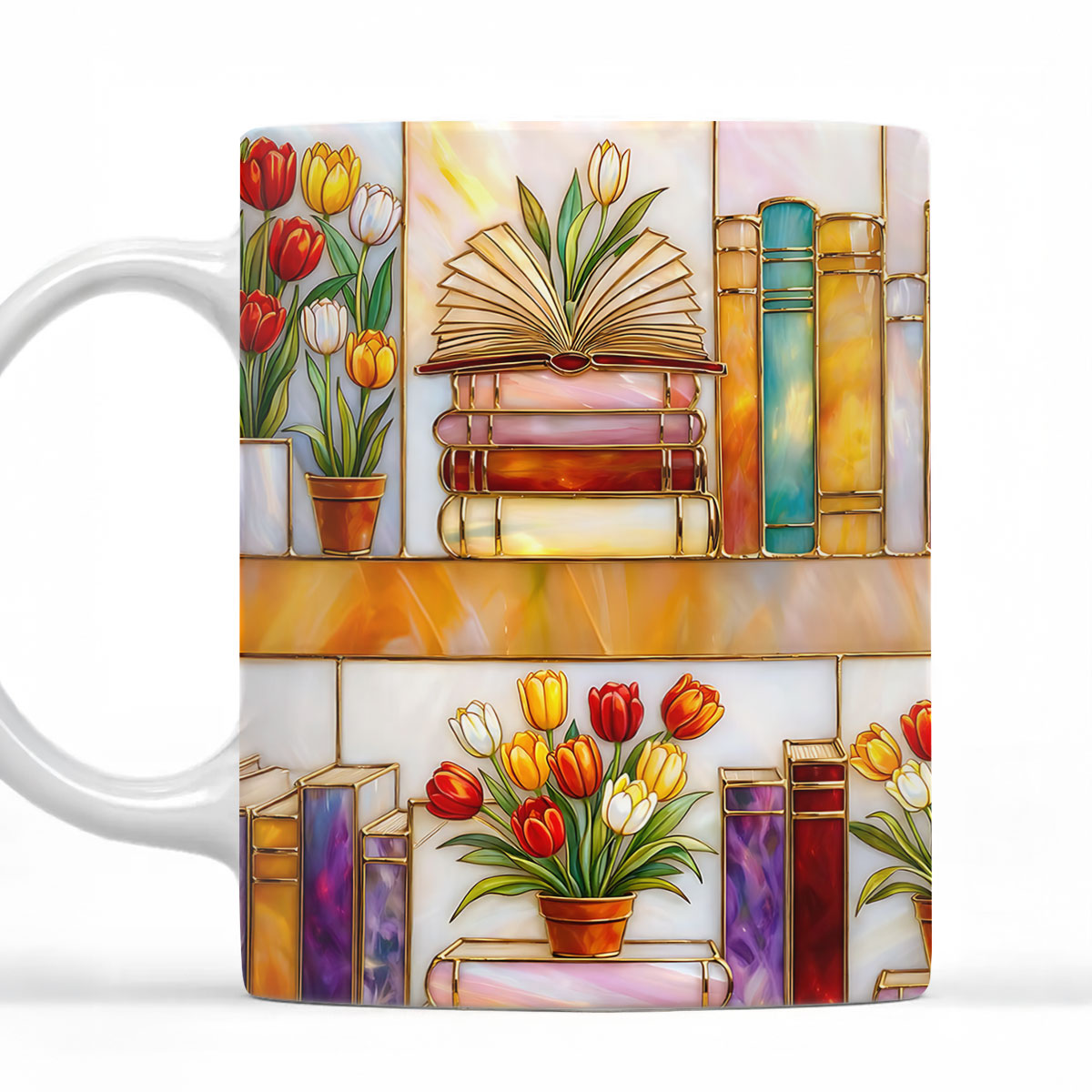 Colorful Books & Tulips In Bloom - Personalized White Edge-to-Edge Mug - Gift For Her, Book Lovers HH01