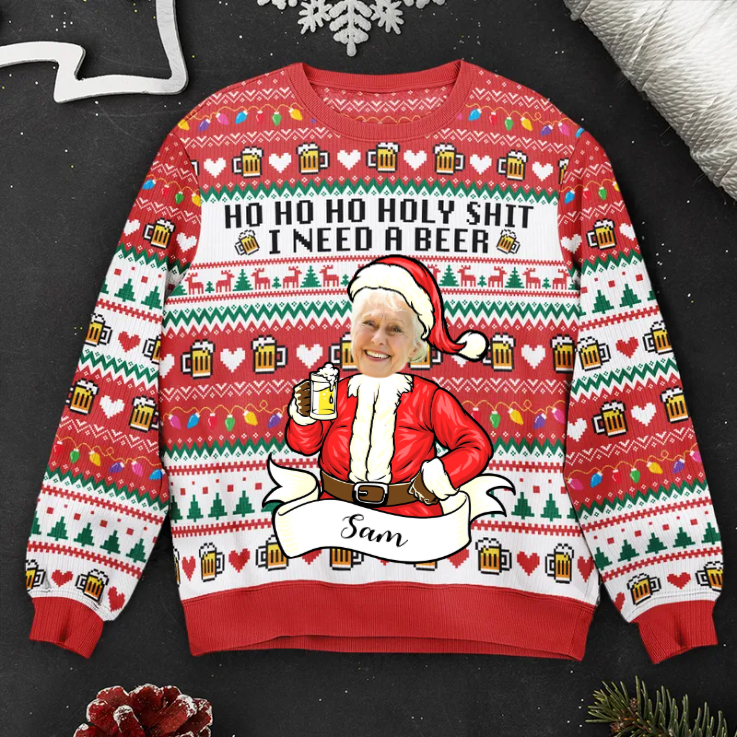 Custom Photo Hohoho Holy Sh*t I Need A Beer - Christmas Gift For Family, Friends - Personalized Ugly Sweatshirt