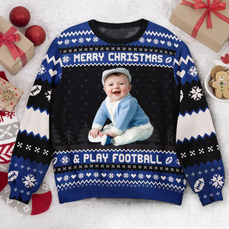 Custom Photo Merry Christmas And Play Football - Personalized Ugly Sweatshirt - Gift for Dad, Grandpa, Husband