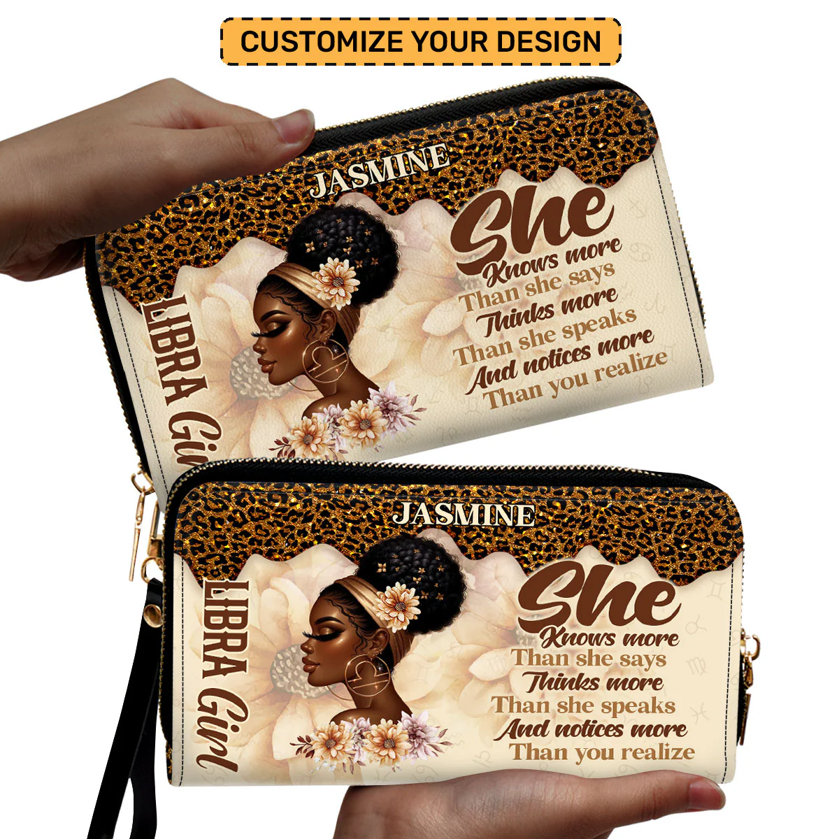 • Custom Zodiac Sign With Leopard Print - Personalized Leather Clutch Purse - Inspirational Gift for Black Women