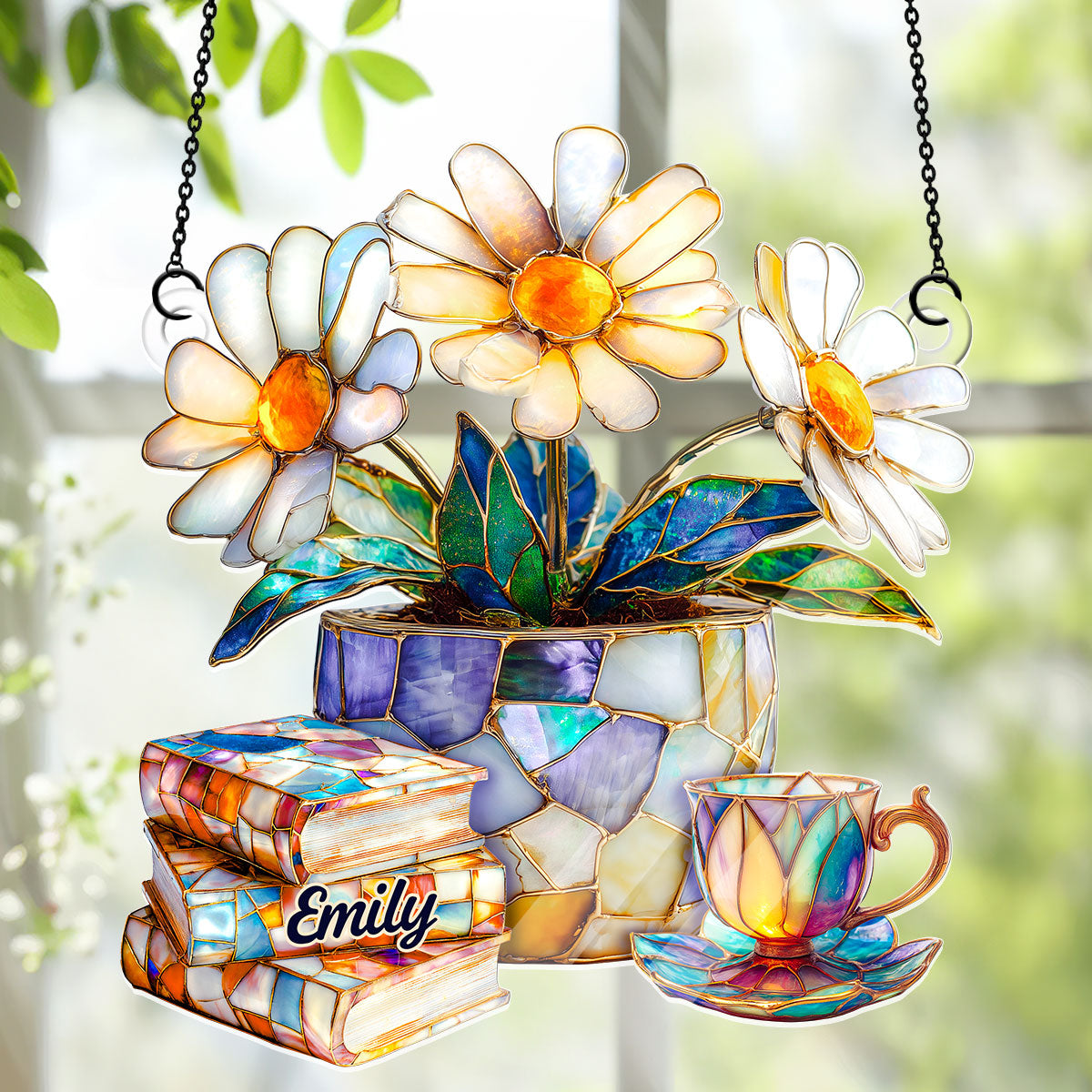 • Daisy, Books, And Tea - Personalized Acrylic Suncatcher - Gift For Book Lovers, Her | HH01