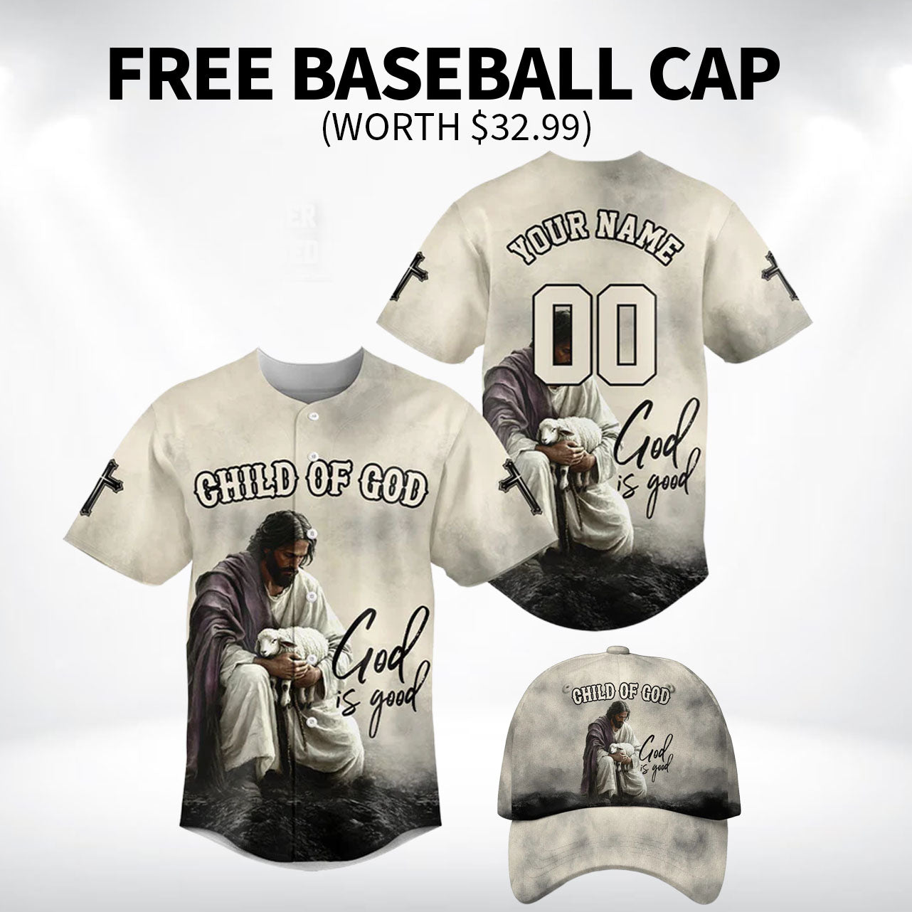 Wear the reminder of God's goodness with the "God Is Good" baseball jersey. This serene design captures Jesus, the Good Shepherd, tenderly holding a lamb, symbolizing His protective and nurturing love. The "Child of God" message at the top signifies your identity as a beloved child of God, and the powerful statement "God is good" reinforces His unwavering goodness in all circumstances.