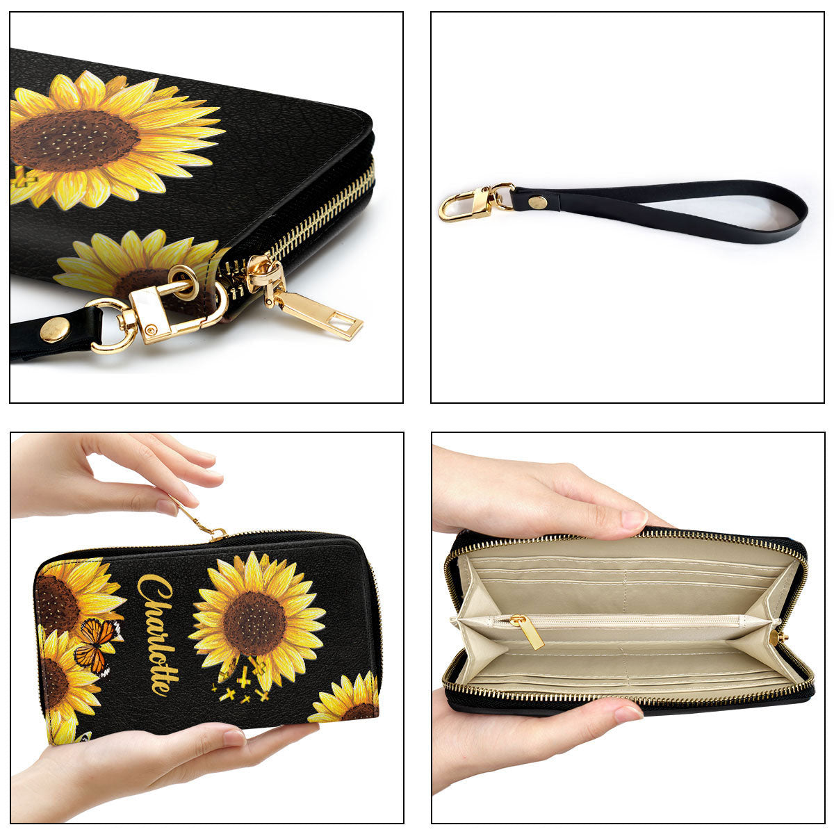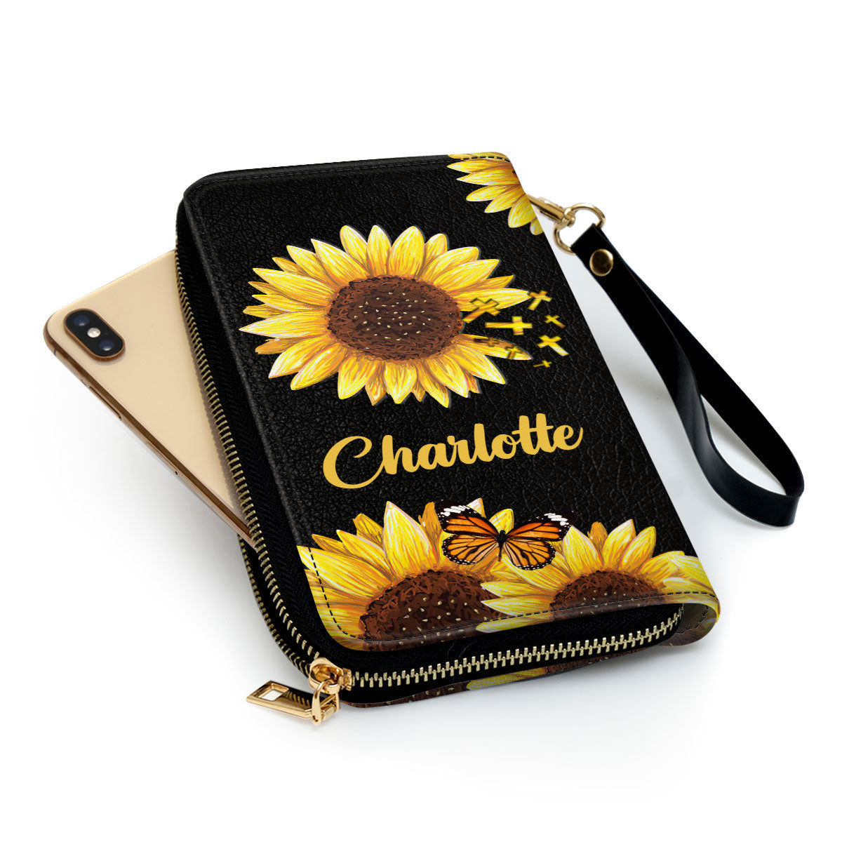 • Removable leather wristlet strap.