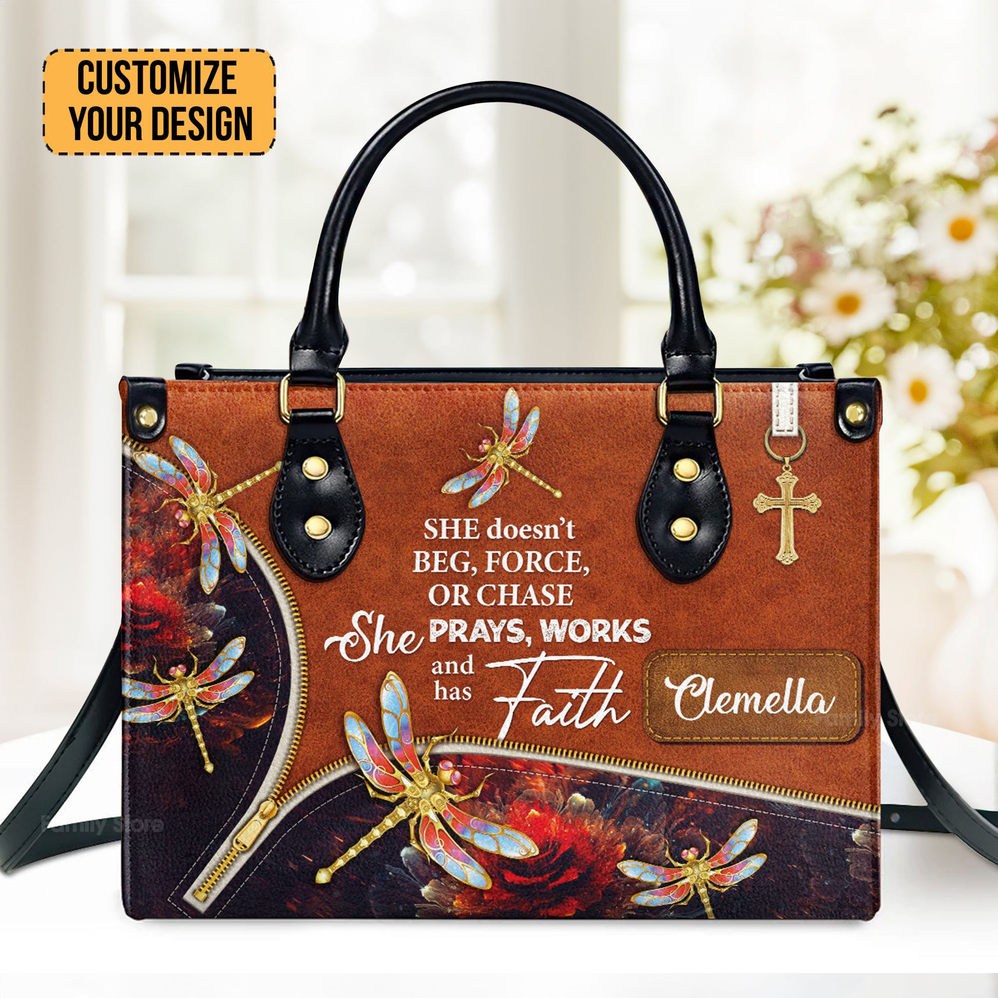 She Prays, Works, And Has Faith Pretty Dragonfly - Unique Personalized Leather Handbag - AT4081413